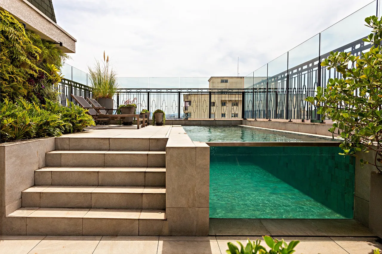 Cobertura com projeto de João Armentano e paisagismo de Gilberto Elkis. No primeiro piso, área íntima com duas suítes, sala de estar com lareira à gás, sala de jantar com terraço integrado e adega climatizada para 120 garrafas, lavabo, cozinha e área de serviço. No piso superior, uma suíte utilizada como escritório, home theater, espaço […]