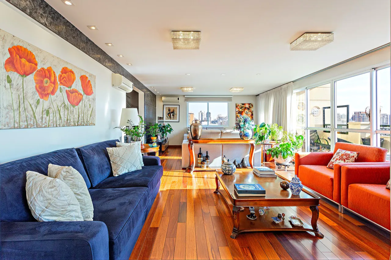 Cobertura rodeada de janelas, varandas e muita luz natural em excelente localização! No piso inferior, sala de estar com varanda, lavabo, sala íntima, sala de jantar, sala de almoço, cozinha, 3 suítes e área de serviço com dependência para funcionária No piso superior, aconchegante sala de TV, suíte principal com closet e escritório, lavabo e […]