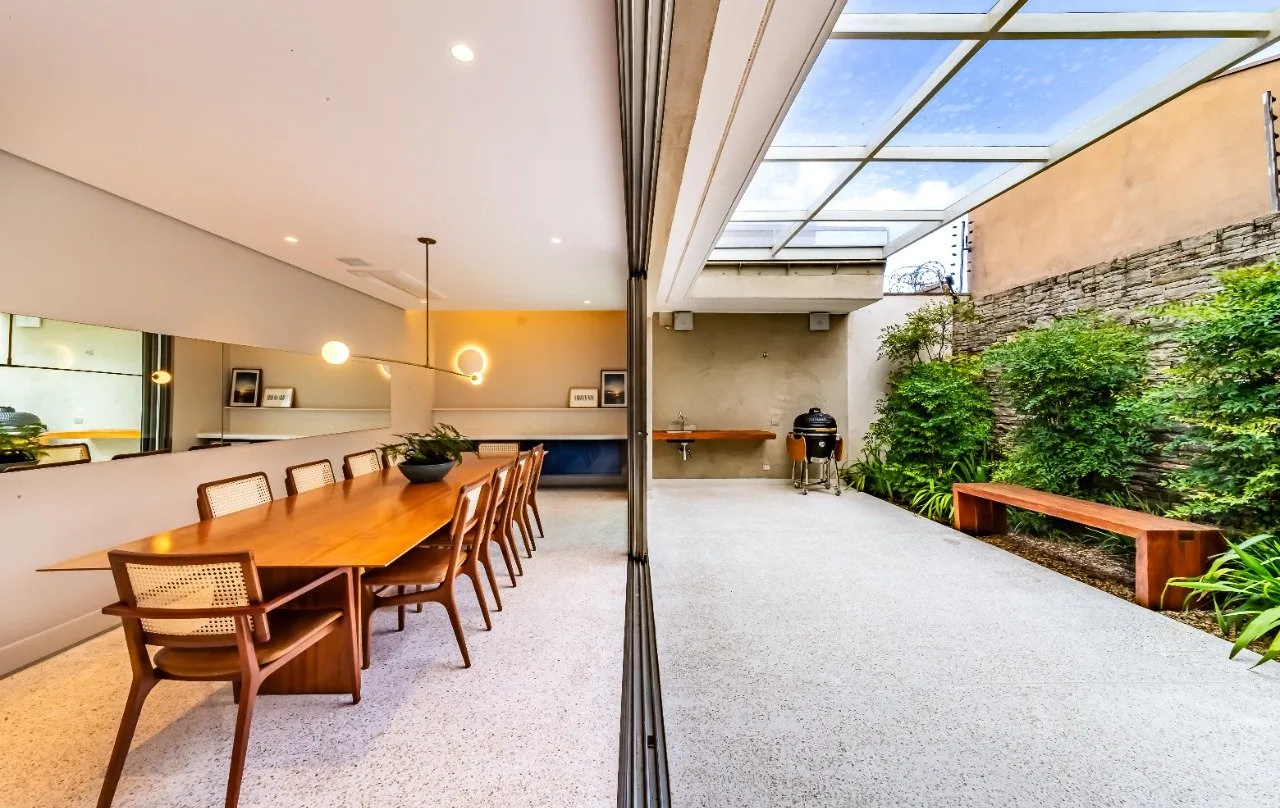 Casa térrea reforça seu aceno ao descanso e prazer com a ampla e iluminada sala para vários ambientes. Espaço é adjunto à sala de jantar que tem integração a uma área externa espaçosa e convidativa com as cadeiras e mesa ali dispostas, envolvidas pelo verde do paisagismo.