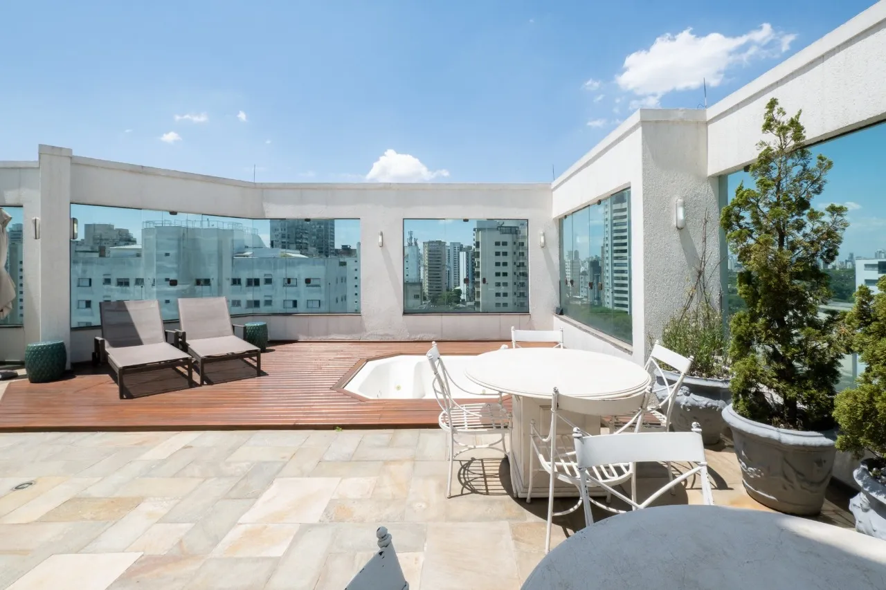 No segundo pavimento, temos a quarta suíte, ampla sala de estar e a segunda cozinha, que serve à área de lazer da cobertura, que conta com terraço, piscina, espaço gourmet e solarium. A cobertura conta com acessos ao segundo andar pelo elevador social, por linda escada na área social e por escada na área de serviço. Dependência de empregada e depósito no apartamento. Seis vagas na garagem, mais depósito. Condomínio com churrasqueira, piscina, salão de festas e sala de ginástica.
