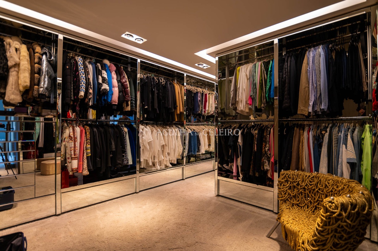 No piso intermediário, o protagonismo é da suíte principal, digna de um set de cinema. Com um closet que é um sonho para qualquer amante de moda e um banheiro com banheira de frente para a varanda privativa, o espaço é um verdadeiro oásis. Os dois outros dormitórios deste andar compartilham um banheiro amplo e são repletos de armários, garantindo praticidade e conforto.